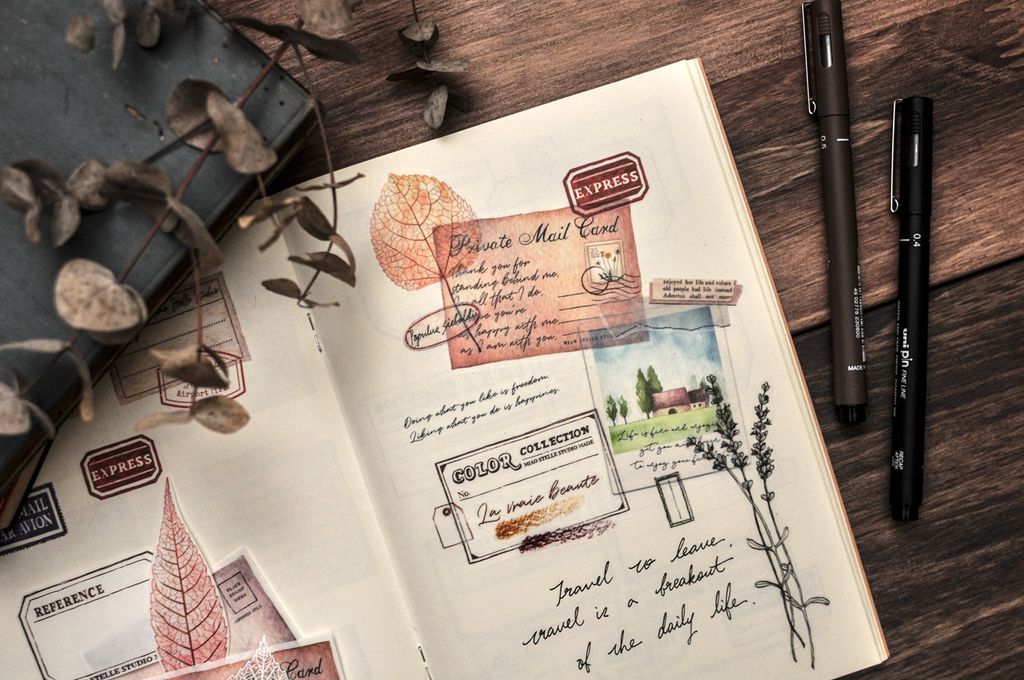 手帳、ノート、カードの飾り付け、封筒を貼る。